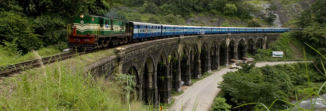 A train passes over the iconic 13 arches bridge at Thenmala, Kollam